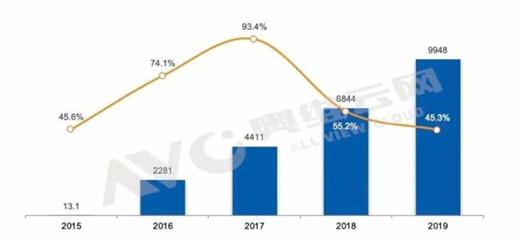 小間距LED高刷高亮、畫質逼真、壽命長、無拼縫的優(yōu)勢,能夠滿足多種場合的應用。在其強大的攻勢下,大量投影、DLP拼墻、液晶顯示代理商、渠道商紛紛轉戰(zhàn)布局小間距LED產品。奧維云網(AVC)《2019年中國大陸小間距LED市場研究報告》顯示:2019年,中國小間距市場銷額9948M元,同比增長45.3%,銷售面積為215.8 K平方米,同比增長97.4%。