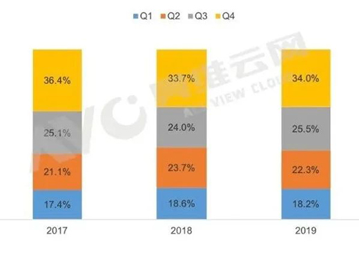 2017-2019年中國小間距LED市場銷額分季度占比情況