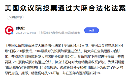 美國眾議院通過立法 將大麻在全美范圍內(nèi)合法化