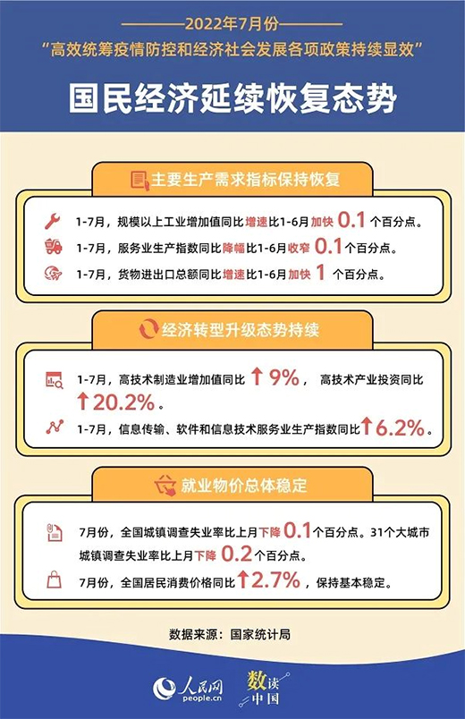生產(chǎn)供給繼續(xù)恢復(fù),就業(yè)物價總體平穩(wěn),對外貿(mào)易增勢良好,民生保障有力有效……15日,國家統(tǒng)計局公布多項數(shù)據(jù)表明,7月份主要指標(biāo)基本穩(wěn)定,國民經(jīng)濟延續(xù)恢復(fù)態(tài)勢。
