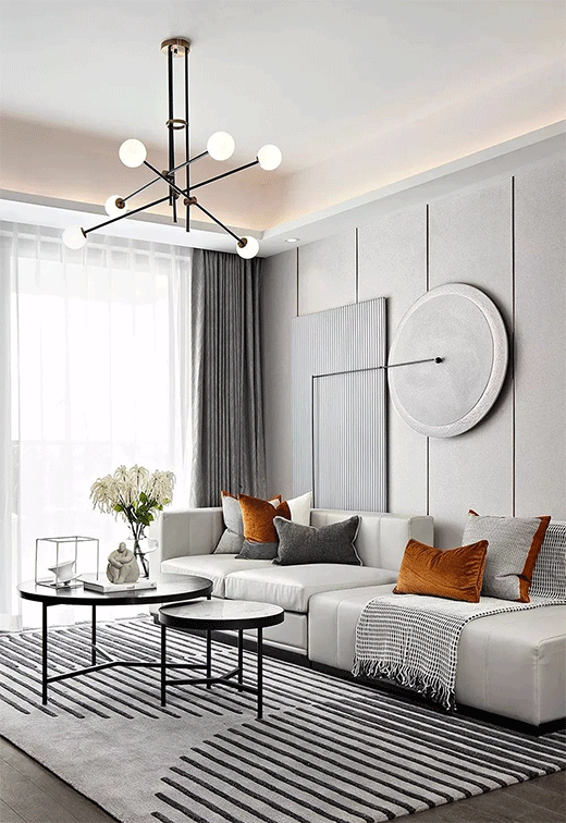 沙發(fā)墻上的裝飾畫組合,方形+圓形的組合設(shè)計(jì),通過(guò)線條貫穿讓畫面統(tǒng)一起來(lái),結(jié)合優(yōu)雅的吊燈,灰色的窗簾搭配,也是顯得更加簡(jiǎn)約而又藝術(shù)感。