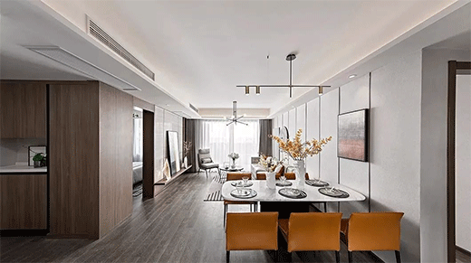 餐廳布置巖板餐桌,在橙色皮質(zhì)餐椅的搭配下,營(yíng)造出一個(gè)時(shí)尚高級(jí)的端莊效果。