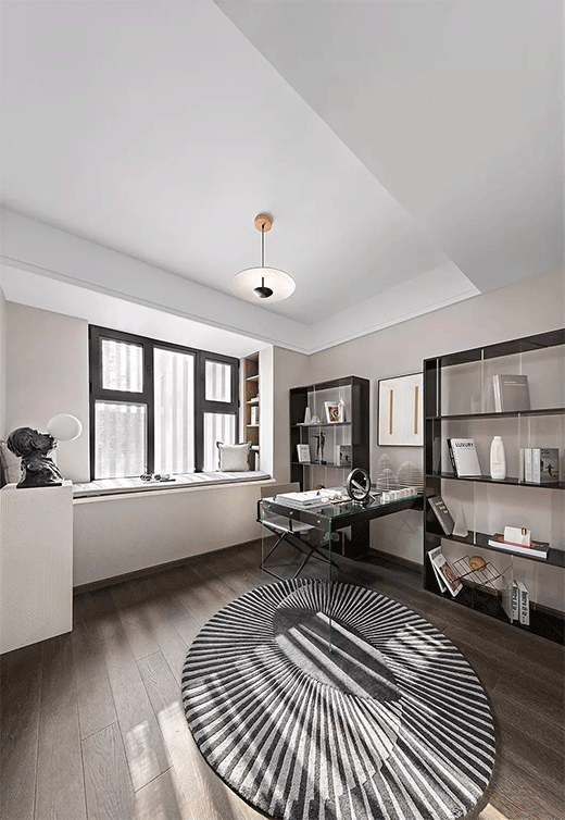 書房整體咖色的溫馨空間,擺上古典端莊的黑色書架書桌,圓形地毯上是幾何放射圖案的設(shè)計(jì),結(jié)合現(xiàn)代精致的擺飾,也讓書房空間更加高級(jí)情趣。