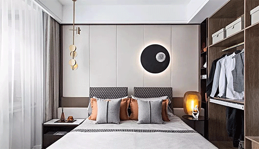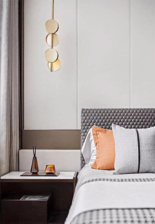 臥室床頭墻的主體是硬包背景墻,硬包以外則是棕咖色的設(shè)計(jì),中間掛上圓形的背光裝飾畫,還有金屬輕奢的吊燈、儒雅的床頭臺(tái)燈,結(jié)合現(xiàn)代優(yōu)雅的床鋪床單布置,也顯得更加華麗端莊而舒適愜意。