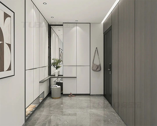 入戶空間一側(cè)是木飾面,另一側(cè)白墻+嵌入式入戶柜,其中入戶柜大面積采用白色,中間增加了灰色的隔板作為柜面,放上植物,簡單中還充滿生機(jī)。