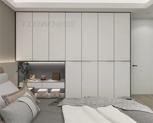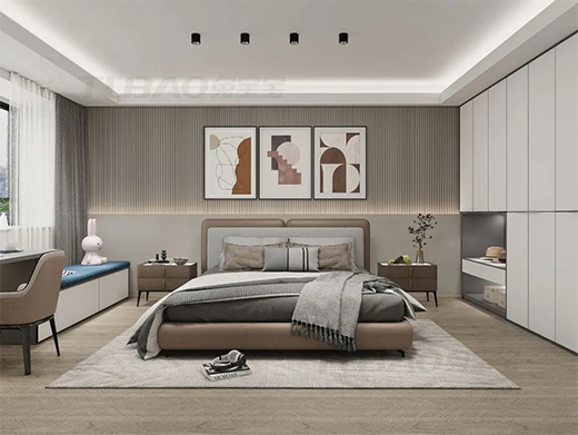 臥室除了柜子、床具和簡單的掛畫,就沒有其他多有的東西,同時燈具也采用了無主燈,整個空間清爽干凈。