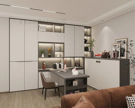 看書時需要一個能靜下心來的空間,書柜制作的時候不需要花里胡哨,只要簡潔實(shí)用即可。比如素沐系列的書柜,白色可以幫助我們放空放松,深色用作開放區(qū)柜體和書桌,則可以讓我們回歸學(xué)習(xí)的理性。書桌設(shè)計(jì)隱藏小妙招,就是側(cè)面的雜志架設(shè)計(jì),營造氛圍感的同時還有提醒自己看書的作用。