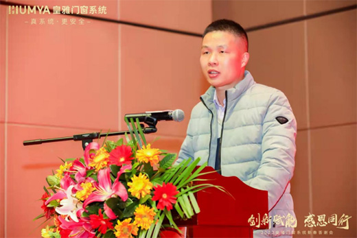 緊接著,答謝會(huì)迎來了最為激動(dòng)人心的時(shí)刻——皇雅門窗系統(tǒng)2022新品發(fā)布會(huì),皇雅招商中心總經(jīng)理周志文先生為我們揭開2022皇雅門窗系統(tǒng)新品的神秘面紗!周總結(jié)合行業(yè)當(dāng)下痛點(diǎn)及未來消費(fèi)發(fā)展趨勢(shì),引出皇雅門窗的品牌定位及產(chǎn)品優(yōu)勢(shì)。他還為大家介紹皇雅門窗系統(tǒng)新產(chǎn)品融入了新的元素,除了在產(chǎn)品外觀上下足功夫外,還在技術(shù)上進(jìn)一步突破,打造出顏值與性能俱佳的高端門窗產(chǎn)品。