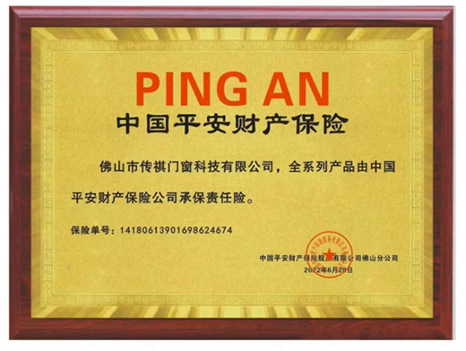 簽署合作前,投保單位及承保產(chǎn)品需要經(jīng)過中國平安保險嚴格的質量認證檢驗、地域檢驗測試,并全面調(diào)研評估品牌的綜合實力、產(chǎn)品質量、知名度及市場信譽度。傳祺門窗順利通過中國平安保險審核,充分體現(xiàn)傳祺門窗品牌過硬的品質與雄厚的實力。