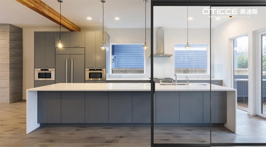 奧迪斯極窄推拉門采用時(shí)尚窄邊框設(shè)計(jì),流暢的線條設(shè)計(jì),不僅能增加美觀性,更開闊的視野感給人愉悅的享受。用于廚房阻隔,其良好的密封性能讓油煙不會(huì)飄散,也能阻隔烹飪雜音,一門多重功能兼?zhèn)洌呛芏嗉彝N房搭配的合適之選。