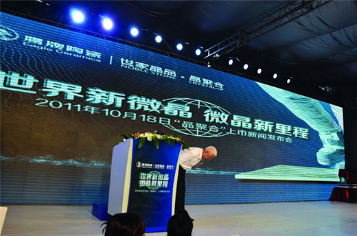 晶聚合新品發(fā)布會(huì)上,時(shí)任中國(guó)陶瓷工業(yè)協(xié)會(huì)理事長(zhǎng)何天雄先生向鷹牌深情一鞠躬