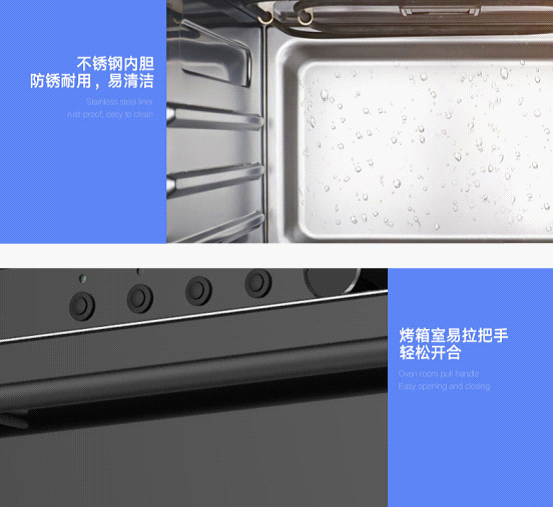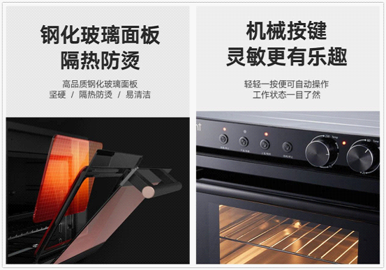 上室烤箱配置不銹鋼內(nèi)膽,在耐高溫、抗腐蝕、性能穩(wěn)定、不易生銹之余,更方便消費者日常清洗,有效保證內(nèi)部的潔凈度;采用高品質(zhì)的鋼化玻璃面板,具有硬度高、耐熱性好等優(yōu)勢,對防止熱炸裂有明顯的效果;配備靈敏的機械按鍵,輕輕一按便可實現(xiàn)自動操作,智能生活輕松享;裝有堅固的易拉把手,輕松一拉,便能實現(xiàn)烤箱門的自由開合。