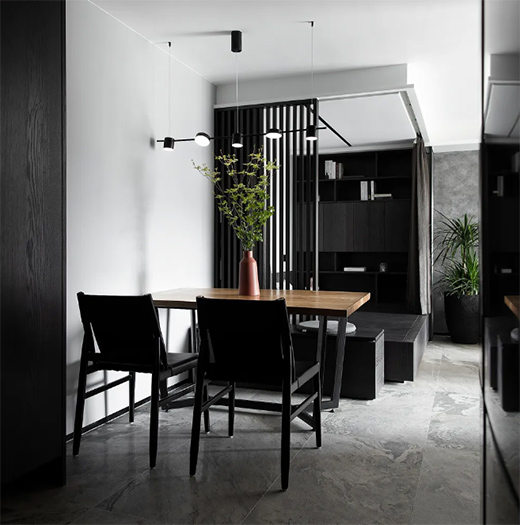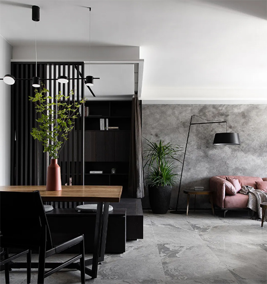 沉靜高級(jí)灰與鮮活綠植的碰撞,或許也是不一樣的動(dòng)靜結(jié)合。
