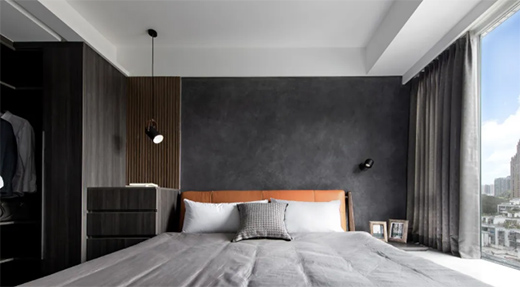 沉穩(wěn)的深灰色背景墻由肌理漆打造,兼具厚重肌理與高級(jí)質(zhì)感,保持與房間內(nèi)家具的色調(diào)一致,延續(xù)著主人的喜好和風(fēng)格,透露出主人時(shí)尚精英的氣質(zhì)。