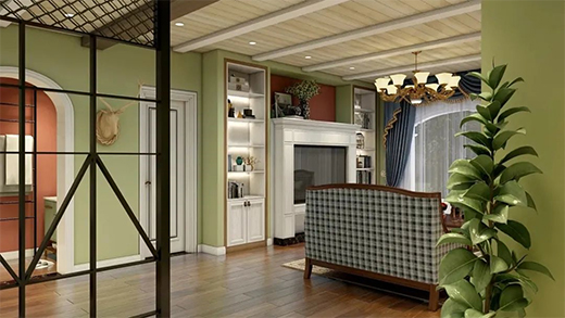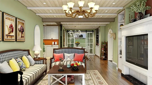 客廳裝修在室內(nèi)環(huán)境中力求表現(xiàn)悠然、舒暢、自然的田園生活情趣,也常運(yùn)用天然木、石、藤、竹、枝等天然植物元素。