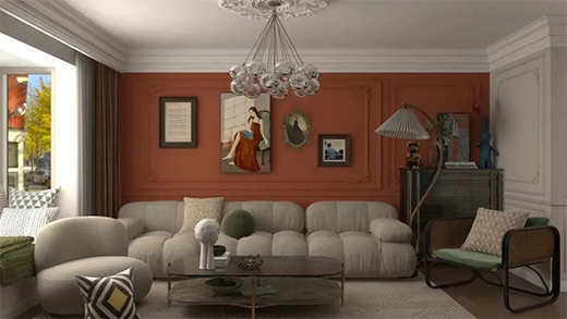 帝卡斯藝術(shù)涂料整個客廳采用大膽的色調(diào)來進行了一場混搭,突破了傳統(tǒng)的設(shè)計,墻面是藝術(shù)漆,以暖白作為整體色系搭配,與復(fù)古裝飾混搭融入其中,把色彩熱烈的碰撞拉回平衡舒適的境地。