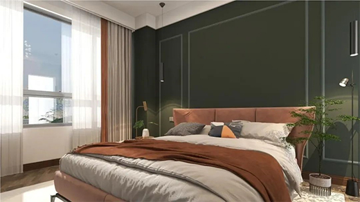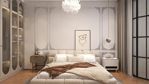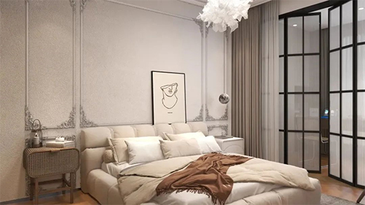 客房相對于主人房會更加沉穩(wěn)內(nèi)斂,暖白與苔蘚綠搭配和諧了整個空間,使空間更有層次感,營造了一個唯美的臥室環(huán)境。