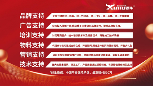 西牛建材不僅在研發(fā)技術(shù)與品質(zhì)管控力量上為合作商提供強有力的保障。同時,在服務上,西牛推出了“成長護航機制”,充分保障空白市場伙伴權(quán)益;6大終端扶持系統(tǒng),品牌、廣告、培訓、物料、營銷、技術(shù)多位一體,以最簡單實用的運營工具、最前瞻的營銷思維全過程指導幫扶,賦能終端,助力合作伙伴們輕松賺錢,實現(xiàn)財富夢想。