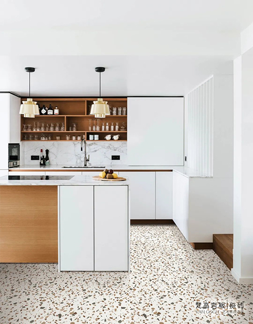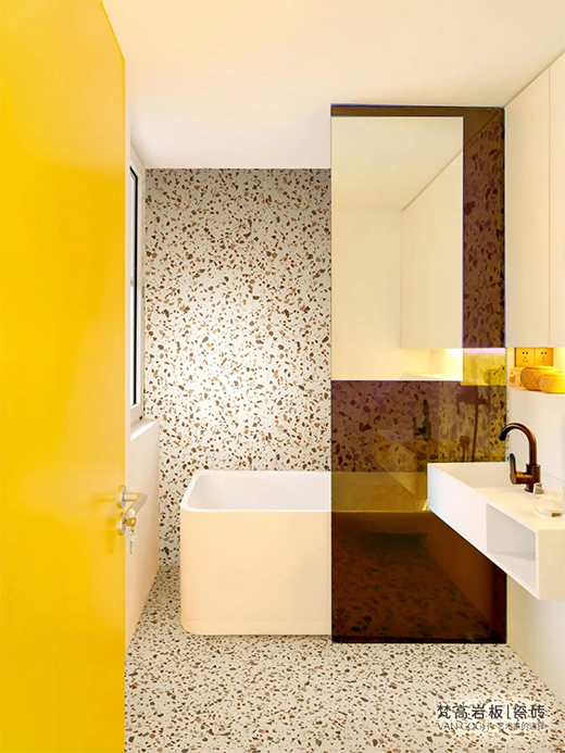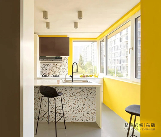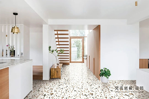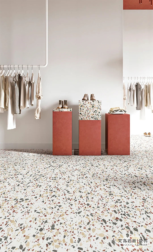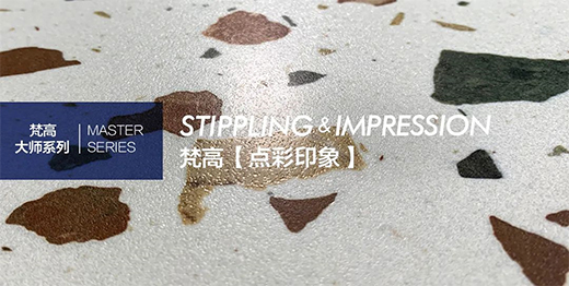 梵高【點彩印象】,從修拉的作品中獲取靈感,將「點彩藝術」技法融入到「彩色水磨石」肌理的重構當中,不規(guī)則的純色顆粒,像油畫色點散落在磚面,看似漫不經心,實則色澤、大小和分布均經由精心設計,繽紛爛漫,又富于藝術氣息。