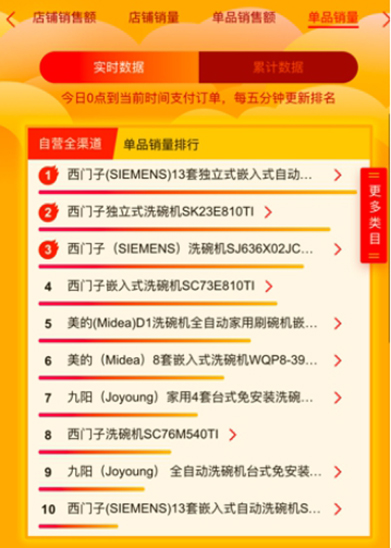 單品銷(xiāo)量榜單上, “嵌入式洗碗機(jī)”似乎更受歡迎,除了去污能力、清潔能力、消毒殺菌能力外,洗碗機(jī)便捷輕巧易于收納的“外觀”成為消費(fèi)者購(gòu)買(mǎi)時(shí)的重要考慮元素。西門(mén)子洗碗機(jī)包攬榜單前4名,美的與九陽(yáng)看似突圍困難,但單品銷(xiāo)售額爆冷也未可知。