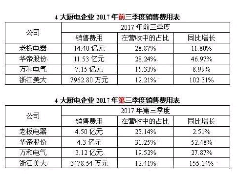 在2017年第三季度報(bào)告中,浙江美大指出,企業(yè)銷售費(fèi)用的增加,主要系報(bào)告期廣告宣傳費(fèi)用增加所致;華帝股份則表明,企業(yè)銷售費(fèi)用的增加主要系品牌提升、渠道拓展及銷售收入增加致廣告費(fèi)、促銷費(fèi)等增加所致。