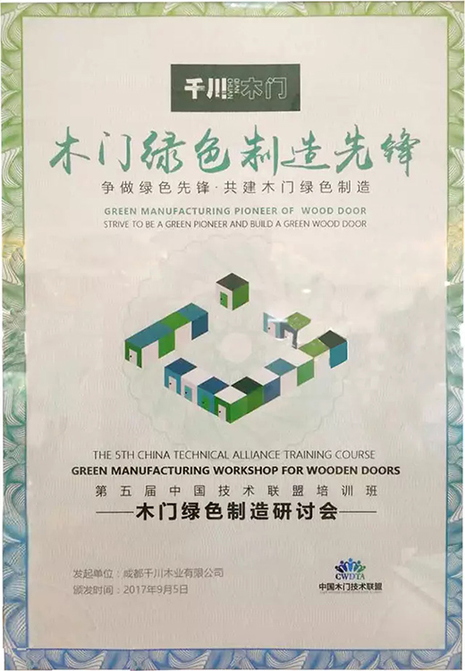 2017年,千川榮獲中國木門技術(shù)聯(lián)盟“木門綠色制造先鋒”稱號。