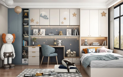 面積較小的房間,榻榻米+柜子+書桌結(jié)合的方式最適合;面積大的可以獨(dú)立設(shè)計(jì)收納和書桌,方便小孩存放玩具、書籍等物品。