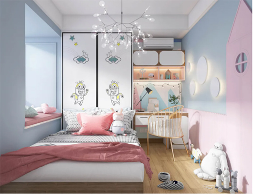 根據(jù)小孩的興趣愛(ài)好來(lái)設(shè)計(jì),例如給喜歡天文知識(shí)的孩子布置一個(gè)有太空感的房間,顏色搭配上最好選用純正鮮艷的顏色,能夠營(yíng)造一個(gè)活潑天真的童趣空間。