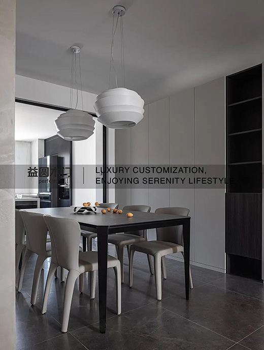 將公共空間的收納更多集中在餐廳的一側(cè),保持恰當(dāng)?shù)捏w量,兼具遮物和陳列兩種功能,柜門留白最大限度讓表明平整無飾,讓空間在視覺上更充裕。