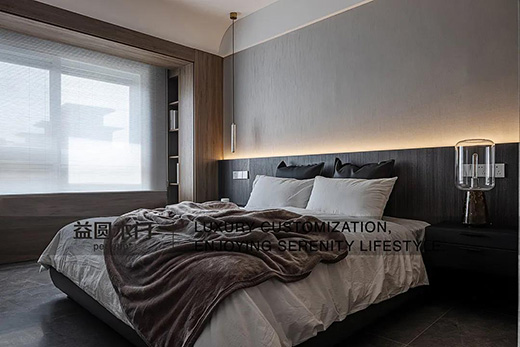 柜體與床頭墻面的木色特地選擇有色差的材質(zhì),拉出層次,避免連成片的深色一不小心就會(huì)太過沉穩(wěn),床笫之間,一切的放松都與木質(zhì)關(guān)聯(lián)。