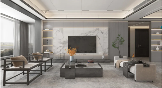 方長系列大板吊頂,營造客廳空間遼闊尺度,大理石紋理與金屬隔板交疊,彰顯功能背景墻的層次感,置身其中,感受無處不在的奢美與典雅。