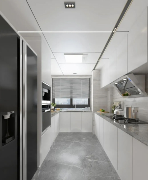 尚Ⅲ系列大板吊頂搭配同色系櫥柜,兩者互相襯托、互相協(xié)調(diào),給人一種清新潔凈之感,搭配友邦新氧涼霸,整體空間極富視覺張力。
