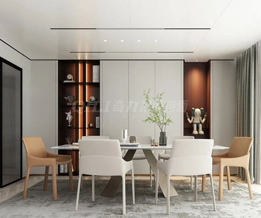 餐廳以白色為底蘊,奇力“天幕”系列大板吊頂干凈利落,沒有過多的細節(jié)雕琢,但沖擊著我們的視覺神經(jīng),高級感十足。