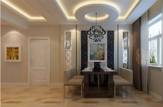 餐廳通常與客廳相連,用吊頂做功能區(qū)分,圓形吊頂配合柔和的燈光纏繞成一首小調(diào),讓餐廳在簡(jiǎn)約的同時(shí)又帶有一絲溫馨的氣息。
