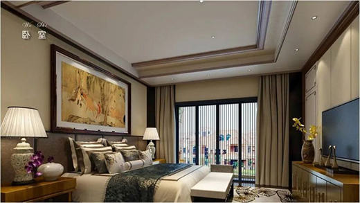 中歐混搭格調(diào)的臥房,采用了中式古風(fēng)壁畫(huà)搭配西式家具臺(tái)燈,營(yíng)造出臥房恰到好處的中式韻味,又不失現(xiàn)代感。吊頂無(wú)主燈設(shè)計(jì),換成錯(cuò)落分布的小筒燈,宛如繁星。