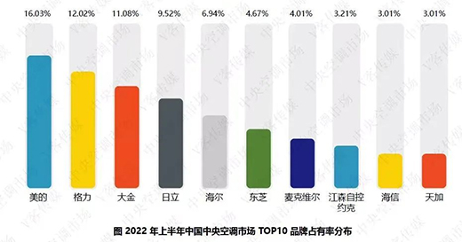 《中央空調(diào)市場》發(fā)布的數(shù)據(jù)顯示,2022年上半年,美的以16.03%的市場占有率位居行業(yè)首位,在離心機、螺桿機、模塊機組等冷水機產(chǎn)品中,美的市場占比均保持國產(chǎn)品牌領(lǐng)先。