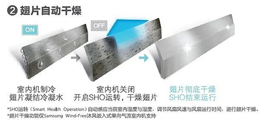 空調(diào)制冷時(shí),室內(nèi)機(jī)翅片上會凝結(jié)冷凝水,關(guān)機(jī)后,附在翅片上未及時(shí)排出的冷凝水隱藏在空調(diào)內(nèi)部,由此可能會滋生細(xì)菌,從而引發(fā)異味。SAMSUNG WindFree?沐風(fēng)嵌入式單向氣流產(chǎn)品三步干燥技術(shù),讓空調(diào)室內(nèi)機(jī)也能保持干凈。第一步,室內(nèi)機(jī)翅片涂層減少細(xì)菌附著,第二步,關(guān)閉空調(diào)時(shí)會自動開啟翅片干燥功能,干燥清潔翅片,防止霉菌滋生。第三步,冷凝水提升泵與止回閥,迅速排出冷凝水,配合止回閥一同避免冷凝水倒灌,防止積水盤滋生細(xì)菌。