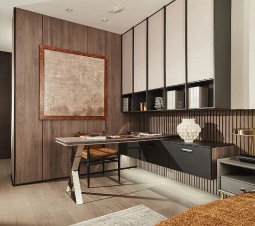 兼具收納、裝飾功能的書柜,利用開放格與封閉柜組合,增強(qiáng)了書房的層次感,為讀書時(shí)營(yíng)造出靜謐的氛圍,造型簡(jiǎn)約的書桌與收納柜連接成一體,表現(xiàn)出空間獨(dú)特的美感,可謂匠心獨(dú)運(yùn)。簡(jiǎn)約的復(fù)古地毯與書桌后的木紋背板相互呼應(yīng),把古典和雅致融合統(tǒng)一。