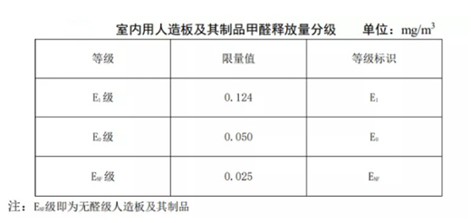 《人造板及其制品甲醛釋放量分級》規(guī)定了室內(nèi)用人造板及其制品甲醛釋放量分級要求、試驗方法以及判定規(guī)則。該標準將室內(nèi)用人造板及其制品的甲醛釋放量按照限量值分為三個等級,即E1級(≤0.124mg/m3)、E0級(≤0.050mg/m3)和ENF級(≤0.025mg/m3)。
