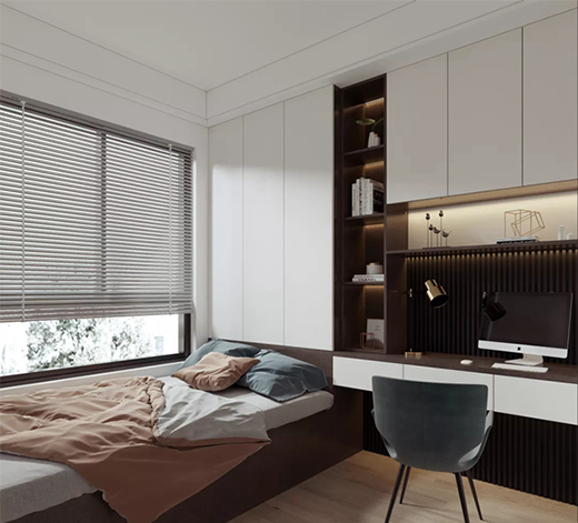 阿爾卑斯白的置頂衣柜,電視柜、梳妝臺一體化的設(shè)計,滿足多樣的收納需求,收納力MAX,擴大人在臥室自由活動的區(qū)域。棕色格柵背景墻,略帶金屬小細節(jié),簡而不失其華,奢不顯其澀,回歸最根本的居住本質(zhì)。