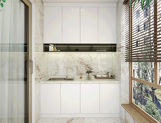 簡(jiǎn)凈的配色、高質(zhì)感的材質(zhì)碰撞,陽(yáng)臺(tái)柜時(shí)尚、年輕的個(gè)性氣息呼之欲出,使得陽(yáng)臺(tái)這隅空間更具備了細(xì)膩、精致的品質(zhì)導(dǎo)向。