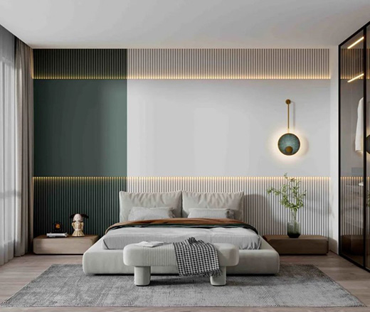 主臥室背景墻的設(shè)計(jì)和客廳的設(shè)計(jì)相呼應(yīng),明亮的白色和派克綠搭配,簡(jiǎn)約清爽透亮又不失優(yōu)雅,讓自然的氣息引進(jìn)臥室里,讓靜謐愜意舒緩一天的疲憊。