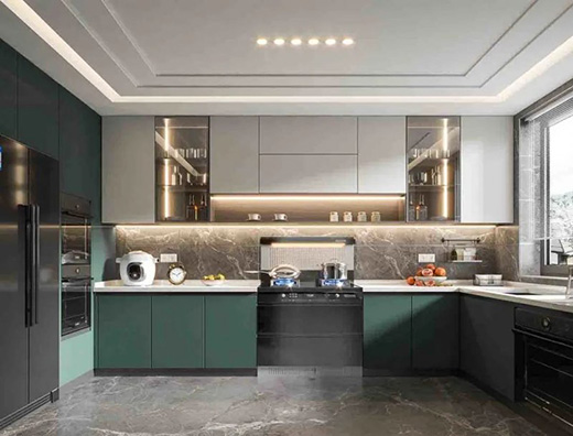 其實(shí)將綠色運(yùn)用到廚房中,也是別有一番風(fēng)味,派克綠和煙灰色的搭配,現(xiàn)代風(fēng)和復(fù)古風(fēng)的融合,營(yíng)造出自然復(fù)古的高級(jí)感,在煙火味濃重的廚房也能,感受到來(lái)自大自然的氣息。