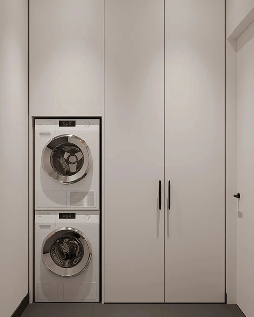 隱形設(shè)計(jì)。隱形設(shè)計(jì)能加強(qiáng)室內(nèi)平面上的平整度,在視覺(jué)上起到簡(jiǎn)潔利落觀感。作為隱形設(shè)計(jì)的一種,無(wú)拉手設(shè)計(jì)用按壓反彈器取代傳統(tǒng)拉手,不會(huì)破壞背景墻的整體造型,使用上也更為方便。