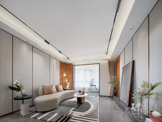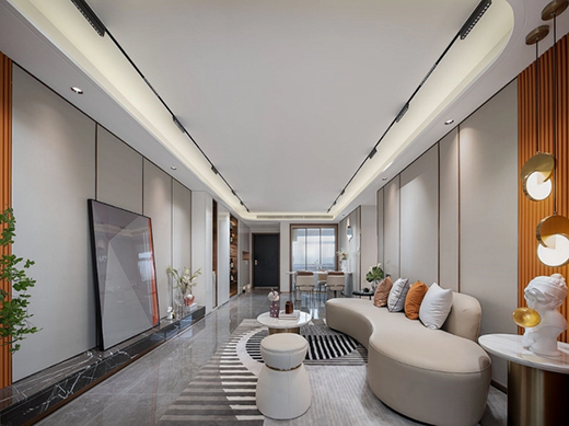 沙發(fā)上搭配幾個暖色系抱枕點綴,兩個茶幾上的藝術品,增加了看空間的藝術美感??看霸O計圓弧型橙色格柵護墻板,藝術吊燈的設計,既裝飾了空間設計感,同時又到了照明的作用。