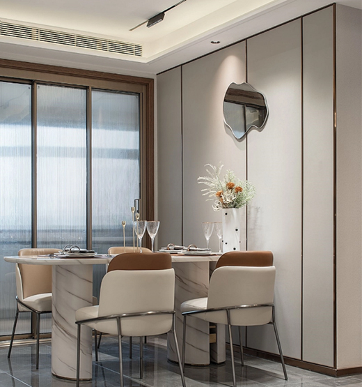 餐廳設計,長虹玻璃滑門的設計,使餐廳與廚房之間增加一個朦朧感。白色的封閉式餐邊柜,增加了儲物空間,白色紋理的大理石餐桌與餐邊柜形成色彩呼應,鐵藝質感的餐椅通過咖啡色進行點綴,暖色系的設計,增加了用餐空間的氛圍。