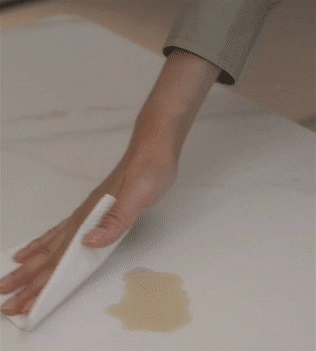 經(jīng)過一番忙活,耐磨耐刮耐高溫的巖板餐臺擺上了幾盤熱氣騰騰的菜肴,光滑臺面上灑落的油漬,只需抹布輕輕擦拭便能輕松清潔干凈。