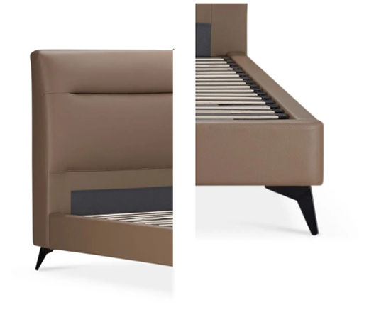 配套的床架與沙發(fā)相呼應(yīng),都是溫暖的摩卡金配色,分段式加高靠背填充了高密度回彈海綿,入睡前倚靠在親膚的頭層牛皮靠背上,玩玩手機(jī)看看書真是不要太愜意啦~