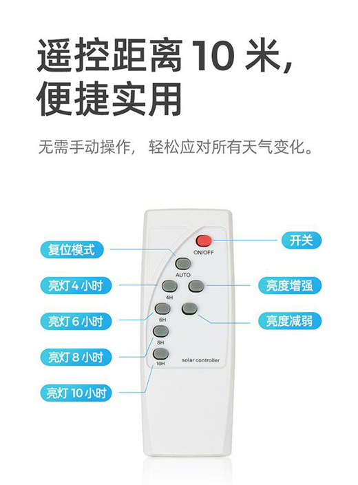 市面上的普通路燈需要人與路燈極近才可以對路燈有所操作,而這款路燈實(shí)現(xiàn)遠(yuǎn)程操控,方便了您的生活,給您配備了遙控器,遙控距離可達(dá)10米,遙控器各種按鈕清晰可見,非常便捷實(shí)用,也避免了壞天氣時(shí)不愛出去的煩惱,讓您體驗(yàn)智能便捷的生活體驗(yàn)!