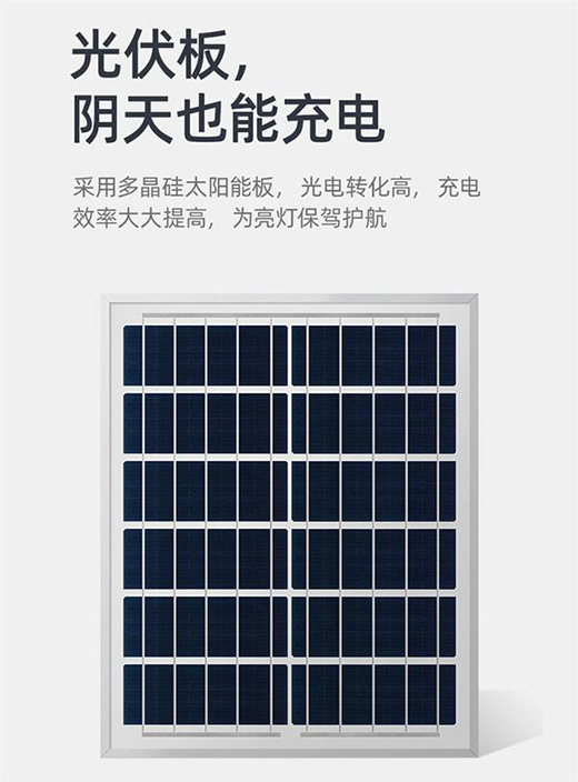 這款路燈采用了多晶硅太陽能板,光電轉(zhuǎn)化高,充電效率大大提高,多晶硅一般采用鋼化玻璃進(jìn)行封存,堅(jiān)固耐用,制作成本低,特殊光伏板,不僅在晴天能充電,在陰天也能充電,太陽能路燈的設(shè)計(jì)能有效的降低常規(guī)能源的消耗,減少耗能耗電,